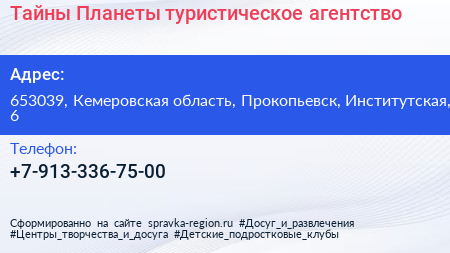 Тайны Планеты, туристическое агентство по адресу 653039, Кемеровская область, Прокопьевск, Институтская, 6 в дальнейшем Организация, размещена в следующих категориях:
