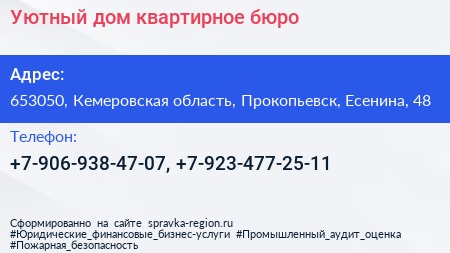 Уютный дом, квартирное бюро по адресу 653050, Кемеровская область, Прокопьевск, Есенина, 48 в дальнейшем Организация, размещена в следующих категориях: