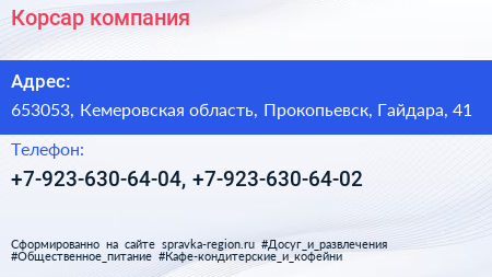 Корсар, компания по адресу 653053, Кемеровская область, Прокопьевск, Гайдара, 41 в дальнейшем Организация, размещена в следующих категориях: