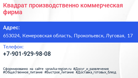 Квадрат, производственно-коммерческая фирма по адресу 653024, Кемеровская область, Прокопьевск, Луговая, 17 в дальнейшем Организация, размещена в следующих категориях:
