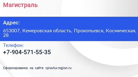 Магистраль по адресу 653007, Кемеровская область, Прокопьевск, Космическая, 28 в дальнейшем Организация, размещена в следующих категориях: