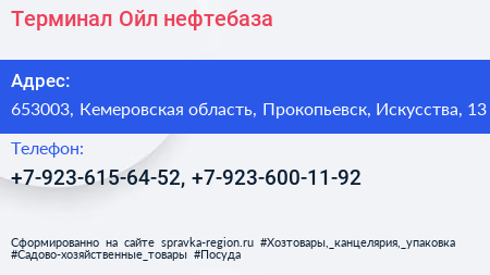 Терминал-Ойл, нефтебаза по адресу 653003, Кемеровская область, Прокопьевск, Искусства, 13 в дальнейшем Организация, размещена в следующих категориях: