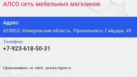 АЛСО, сеть мебельных магазинов по адресу 653053, Кемеровская область, Прокопьевск, Гайдара, 41 в дальнейшем Организация, размещена в следующих категориях: