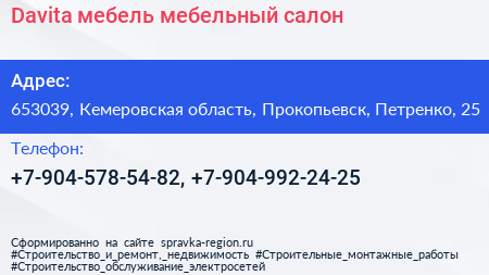 Davita-мебель, мебельный салон по адресу 653039, Кемеровская область, Прокопьевск, Петренко, 25 в дальнейшем Организация, размещена в следующих категориях: