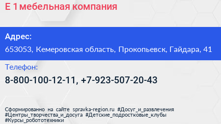 Е 1, мебельная компания по адресу 653053, Кемеровская область, Прокопьевск, Гайдара, 41 в дальнейшем Организация, размещена в следующих категориях: