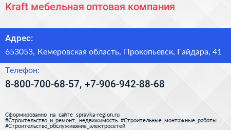 Kraft, мебельная оптовая компания по адресу 653053, Кемеровская область, Прокопьевск, Гайдара, 41 в дальнейшем Организация, размещена в следующих категориях: