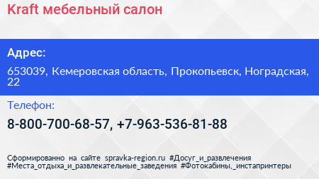 Kraft, мебельный салон по адресу 653039, Кемеровская область, Прокопьевск, Ноградская, 22 в дальнейшем Организация, размещена в следующих категориях: