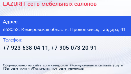 LAZURIT, сеть мебельных салонов по адресу 653053, Кемеровская область, Прокопьевск, Гайдара, 41 в дальнейшем Организация, размещена в следующих категориях: