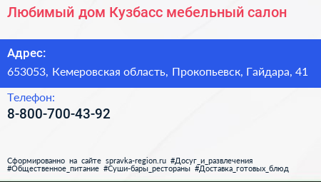 Любимый дом Кузбасс, мебельный салон по адресу 653053, Кемеровская область, Прокопьевск, Гайдара, 41 в дальнейшем Организация, размещена в следующих категориях: