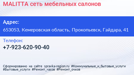 MALITTA, сеть мебельных салонов по адресу 653053, Кемеровская область, Прокопьевск, Гайдара, 41 в дальнейшем Организация, размещена в следующих категориях: