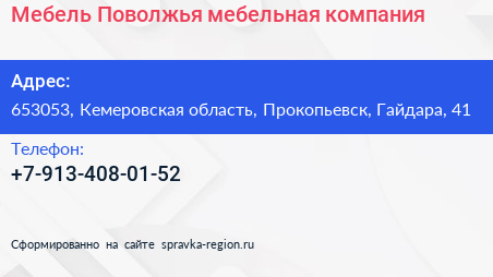 Мебель Поволжья, мебельная компания по адресу 653053, Кемеровская область, Прокопьевск, Гайдара, 41 в дальнейшем Организация, размещена в следующих категориях: