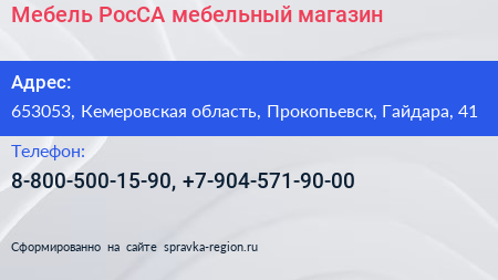 Мебель РосСА, мебельный магазин по адресу 653053, Кемеровская область, Прокопьевск, Гайдара, 41 в дальнейшем Организация, размещена в следующих категориях: