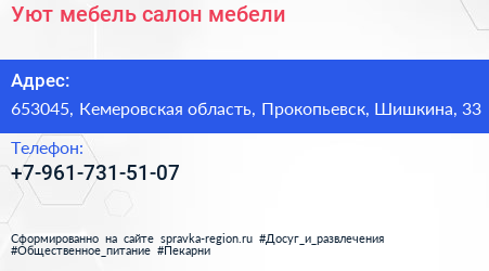 Уют мебель, салон мебели по адресу 653045, Кемеровская область, Прокопьевск, Шишкина, 33 в дальнейшем Организация, размещена в следующих категориях: