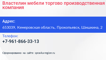 Властелин мебели, торгово-производственная компания по адресу 653039, Кемеровская область, Прокопьевск, Шишкина, 2 в дальнейшем Организация, размещена в следующих категориях: