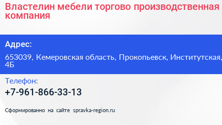 Властелин мебели, торгово-производственная компания по адресу 653039, Кемеровская область, Прокопьевск, Институтская, 4Б в дальнейшем Организация, размещена в следующих категориях: