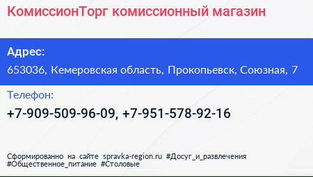 КомиссионТорг, комиссионный магазин по адресу 653036, Кемеровская область, Прокопьевск, Союзная, 7 в дальнейшем Организация, размещена в следующих категориях: