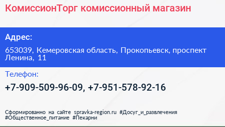 КомиссионТорг, комиссионный магазин по адресу 653039, Кемеровская область, Прокопьевск, проспект Ленина, 11 в дальнейшем Организация, размещена в следующих категориях: