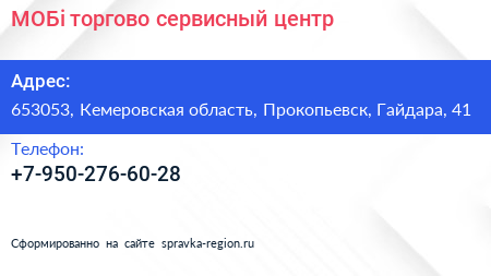 МОБi, торгово-сервисный центр по адресу 653053, Кемеровская область, Прокопьевск, Гайдара, 41 в дальнейшем Организация, размещена в следующих категориях: