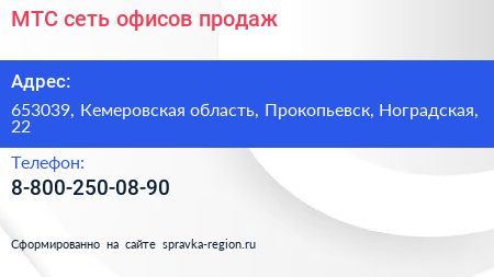 МТС, сеть офисов продаж по адресу 653039, Кемеровская область, Прокопьевск, Ноградская, 22 в дальнейшем Организация, размещена в следующих категориях: