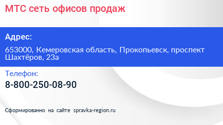 МТС, сеть офисов продаж по адресу 653000, Кемеровская область, Прокопьевск, проспект Шахтёров, 23а в дальнейшем Организация, размещена в следующих категориях: