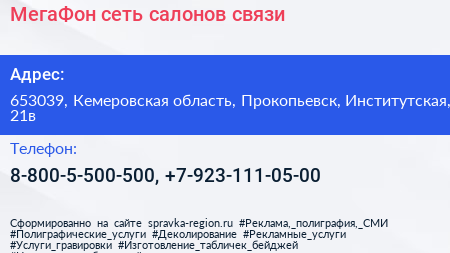 МегаФон, сеть салонов связи по адресу 653039, Кемеровская область, Прокопьевск, Институтская, 21в в дальнейшем Организация, размещена в следующих категориях: