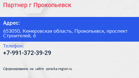 Партнер, г. Прокопьевск по адресу 653050, Кемеровская область, Прокопьевск, проспект Строителей, 6 в дальнейшем Организация, размещена в следующих категориях: