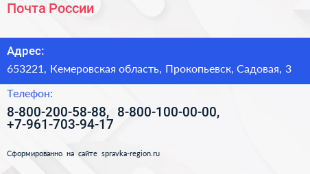 Почта России по адресу 653221, Кемеровская область, Прокопьевск, Садовая, 3 в дальнейшем Организация, размещена в следующих категориях: