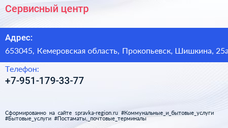 Сервисный центр по адресу 653045, Кемеровская область, Прокопьевск, Шишкина, 25а в дальнейшем Организация, размещена в следующих категориях: