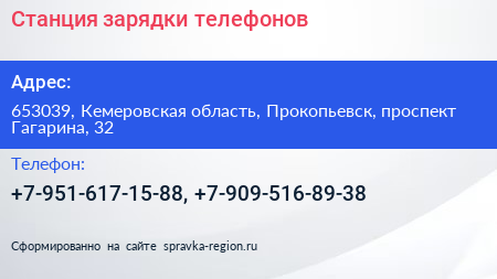 Станция зарядки телефонов по адресу 653039, Кемеровская область, Прокопьевск, проспект Гагарина, 32 в дальнейшем Организация, размещена в следующих категориях: