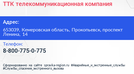 ТТК, телекоммуникационная компания по адресу 653039, Кемеровская область, Прокопьевск, проспект Ленина, 14 в дальнейшем Организация, размещена в следующих категориях:
