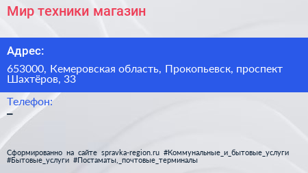 Мир техники, магазин по адресу 653000, Кемеровская область, Прокопьевск, проспект Шахтёров, 33 в дальнейшем Организация, размещена в следующих категориях: