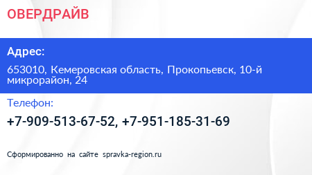 ОВЕРДРАЙВ по адресу 653010, Кемеровская область, Прокопьевск, 10-й микрорайон, 24 в дальнейшем Организация, размещена в следующих категориях: