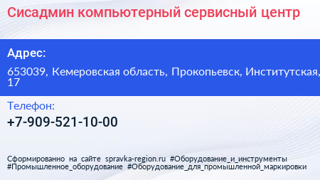 Сисадмин, компьютерный сервисный центр по адресу 653039, Кемеровская область, Прокопьевск, Институтская, 17 в дальнейшем Организация, размещена в следующих категориях: