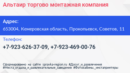 Альтаир, торгово-монтажная компания по адресу 653004, Кемеровская область, Прокопьевск, Советов, 11 в дальнейшем Организация, размещена в следующих категориях: