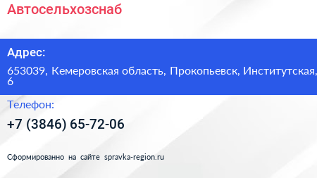 Автосельхозснаб по адресу 653039, Кемеровская область, Прокопьевск, Институтская, 6 в дальнейшем Организация, размещена в следующих категориях: