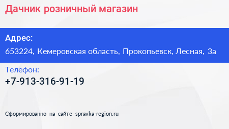 Дачник, розничный магазин по адресу 653224, Кемеровская область, Прокопьевск, Лесная, 3а в дальнейшем Организация, размещена в следующих категориях: