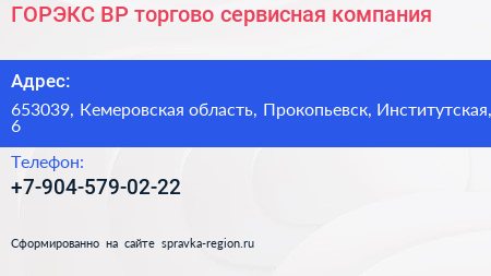 ГОРЭКС-ВР, торгово-сервисная компания по адресу 653039, Кемеровская область, Прокопьевск, Институтская, 6 в дальнейшем Организация, размещена в следующих категориях: