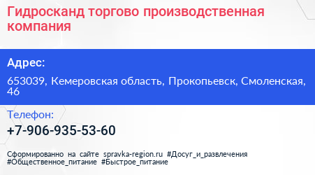 Гидросканд, торгово-производственная компания по адресу 653039, Кемеровская область, Прокопьевск, Смоленская, 46 в дальнейшем Организация, размещена в следующих категориях: