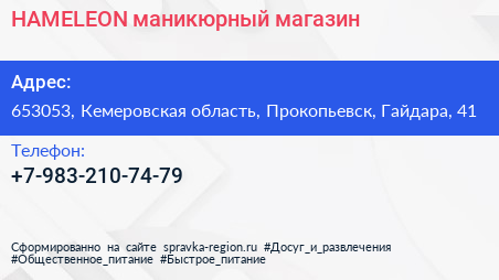 HAMELEON, маникюрный магазин по адресу 653053, Кемеровская область, Прокопьевск, Гайдара, 41 в дальнейшем Организация, размещена в следующих категориях: