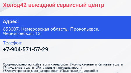Холод42, выездной сервисный центр по адресу 653007, Кемеровская область, Прокопьевск, Черниговская, 13 в дальнейшем Организация, размещена в следующих категориях: