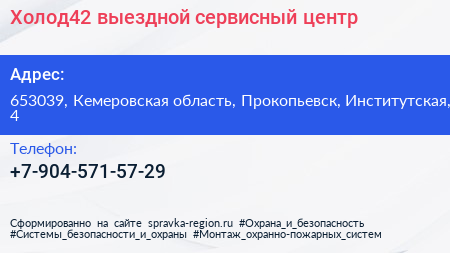 Холод42, выездной сервисный центр по адресу 653039, Кемеровская область, Прокопьевск, Институтская, 4 в дальнейшем Организация, размещена в следующих категориях: