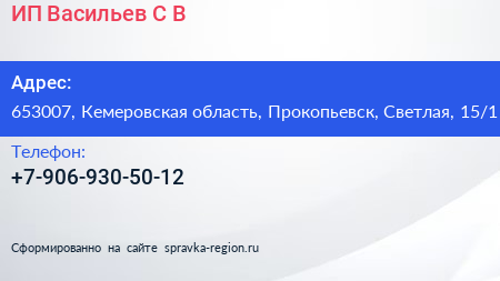 ИП Васильев С.В. по адресу 653007, Кемеровская область, Прокопьевск, Светлая, 15/1 в дальнейшем Организация, размещена в следующих категориях: