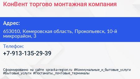 КонВент, торгово-монтажная компания по адресу 653010, Кемеровская область, Прокопьевск, 10-й микрорайон, 3 в дальнейшем Организация, размещена в следующих категориях: