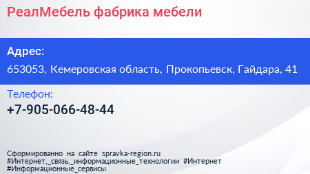 РеалМебель, фабрика мебели по адресу 653053, Кемеровская область, Прокопьевск, Гайдара, 41 в дальнейшем Организация, размещена в следующих категориях: