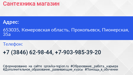 Сантехника, магазин по адресу 653035, Кемеровская область, Прокопьевск, Пионерская, 35а в дальнейшем Организация, размещена в следующих категориях: