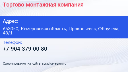 Торгово-монтажная компания по адресу 653050, Кемеровская область, Прокопьевск, Обручева, 48/1 в дальнейшем Организация, размещена в следующих категориях: