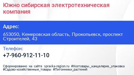 Южно-сибирская электротехническая компания по адресу 653050, Кемеровская область, Прокопьевск, проспект Строителей, 43 в дальнейшем Организация, размещена в следующих категориях: