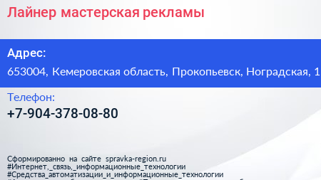 Лайнер, мастерская рекламы по адресу 653004, Кемеровская область, Прокопьевск, Ноградская, 1 в дальнейшем Организация, размещена в следующих категориях: