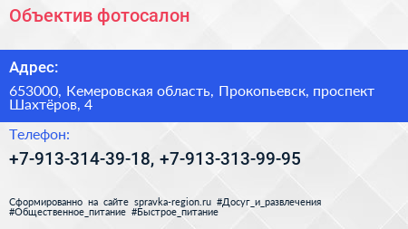 Объектив, фотосалон по адресу 653000, Кемеровская область, Прокопьевск, проспект Шахтёров, 4 в дальнейшем Организация, размещена в следующих категориях: