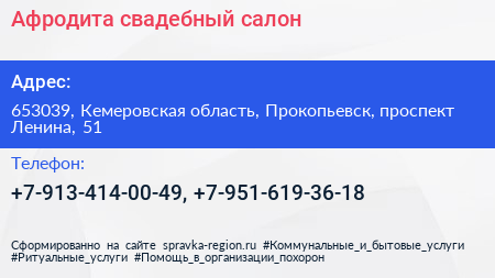 Афродита, свадебный салон по адресу 653039, Кемеровская область, Прокопьевск, проспект Ленина, 51 в дальнейшем Организация, размещена в следующих категориях:
